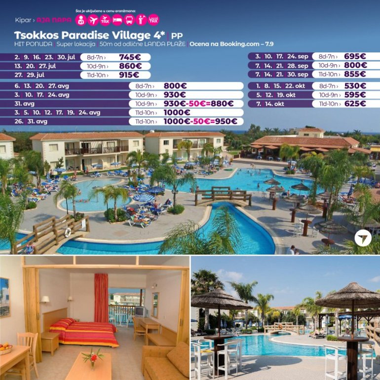 Tsokkos Paradise Village 4* - Ovo odmaralište sa 4 zvezdice nalazi se u letovalištu Aja Napa. Nudi zatvoreni bazen, fitnes centar, saunu i otvoreni bazen nepravilnog oblika, okružen nameštenom terasom za sunčanje. Sadržaji odmarališta Tsokkos Paradise takođe obuhvataju restoran-bar pored bazena, igraonicu sa bilijarom, teniski teren i mini-market.