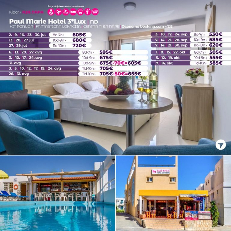 Objekat Paul Marie Hotel 3*Lux je smešten u centru letovališta Aja Napa i raspolaže restoranom i krovnim bazenom na otvorenom. WiFi je dostupan u zajedničkim prostorijama. Studiji i apartmani u objektu Paul Marie Hotel sadrže prostor za sedenje i balkon sa pogledom na vrt. Osim toga, imaju čajnu kuhinju sa pločama za kuvanje i posuđem. Kupatila u smeštajnim jedinicama su opremljena fenom za kosu i tušem. Objekat Paul Marie Hotel Apartments takođe nudi snek bar i recepciju koja radi non-stop. Međunarodni aerodrom Larnaka je udaljen oko 60km. Ponuda objekta obuhvata i besplatan parking.