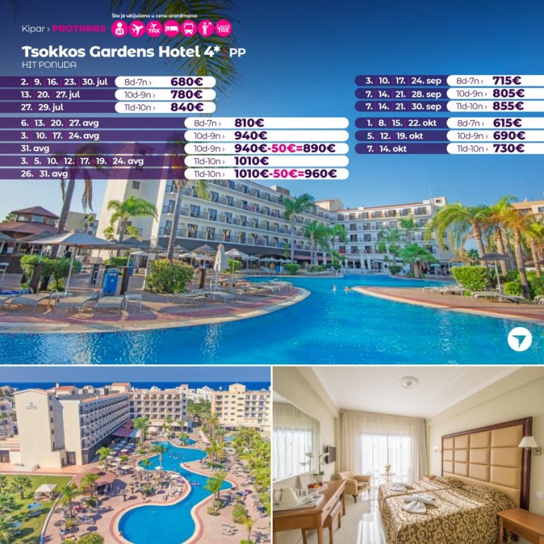 Tsokkos Gardens Hotel 4* - Ovaj objekat je udaljen 10 min hoda od plaže. Smešten u Protarasu, objekat Tsokkos Gardens Hotel nudi otvoreni bazen sa zasebnim delom za decu i terasu za sunčanje sa nameštajem na otvorenom. Hotel je udaljen 800 metara od plaže Sanrajz (Sunrise). Plaža Kalamies udaljena je 2,5 km, a plaža Konos 3,8 km.