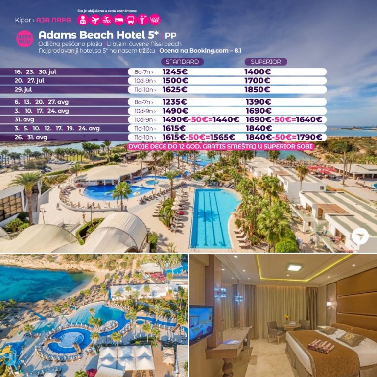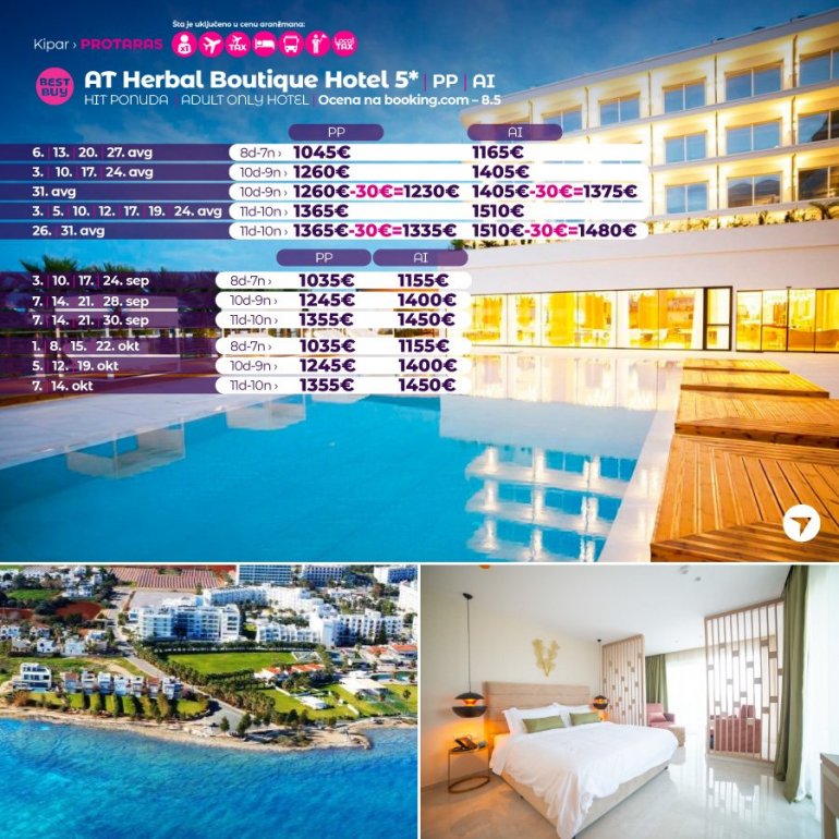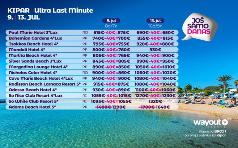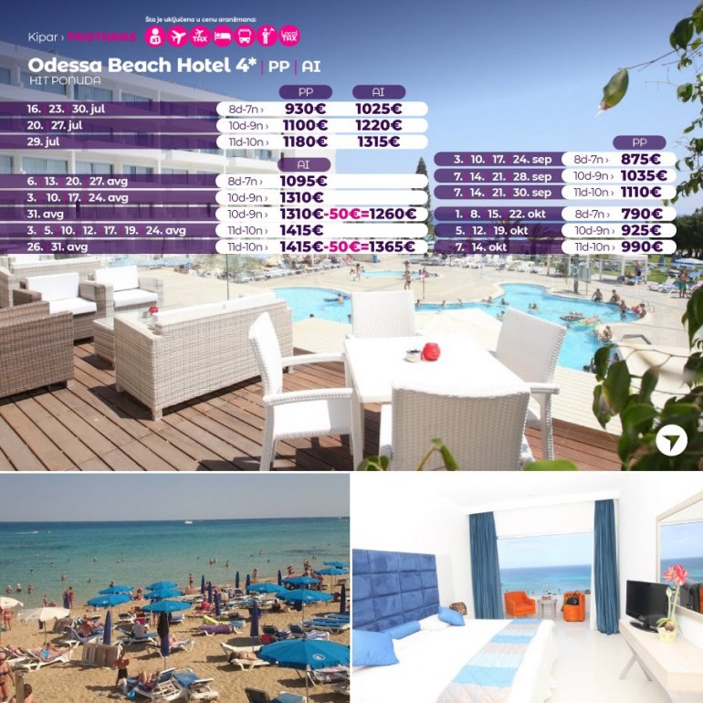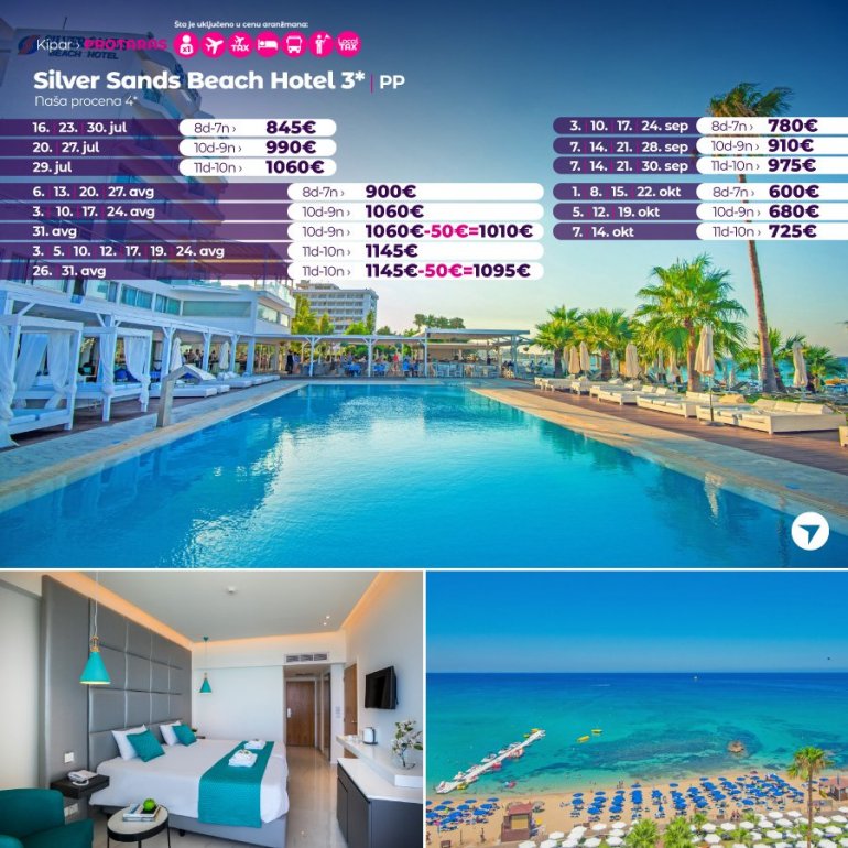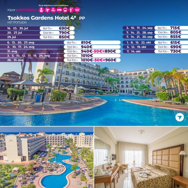 Definitivno nova omiljena letnja destinacija naših turista, svakako jeste rajsko ostrvo Kipar. Osetite čari Mediterana, fantastičnih plaža, veoma kvalitetnih hotela, izuzetne gastronomske ponude, kao i nezaboravnog noćnog provoda. Za naše putnike smo spremili odličnu first minute ponudu sa pažljivo izabranim hotelima, kako na osnovu pređašnjih iskustava naših klijenata, tako i na osnovu odličnih ocena na turističkim portalima.