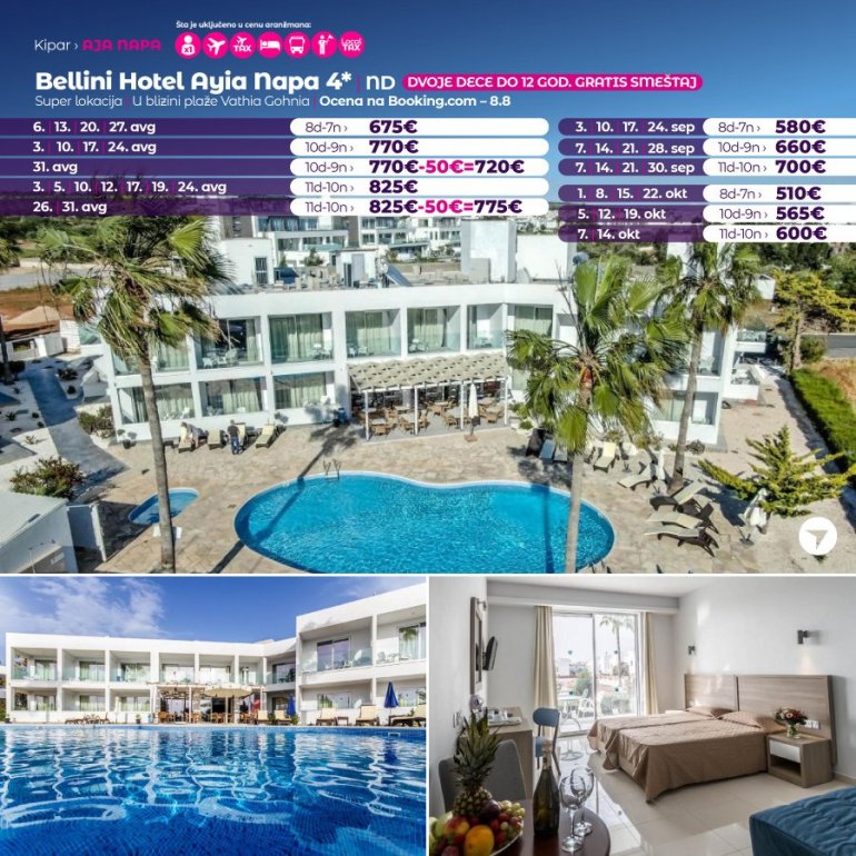 Potpuno renoviran hotel Bellini Ayia Napa je smešten u Aveniji Nisi (Nissi Avenue), u srcu Aja Nape (Ayia Napa). U ponudi ima izvanredno uređene apartmane. Osim toga, nudi studije i suite jedinice koje se nalaze oko privatnog bazena, bara i restorana. Plaže Pernera i Sendi Bej (Sandy Bay) udaljene su oko 500 metara od objekta. Plaža Nisi (Nissi Beach) je udaljena 2 km, a Akva park Waterworld 3 km.