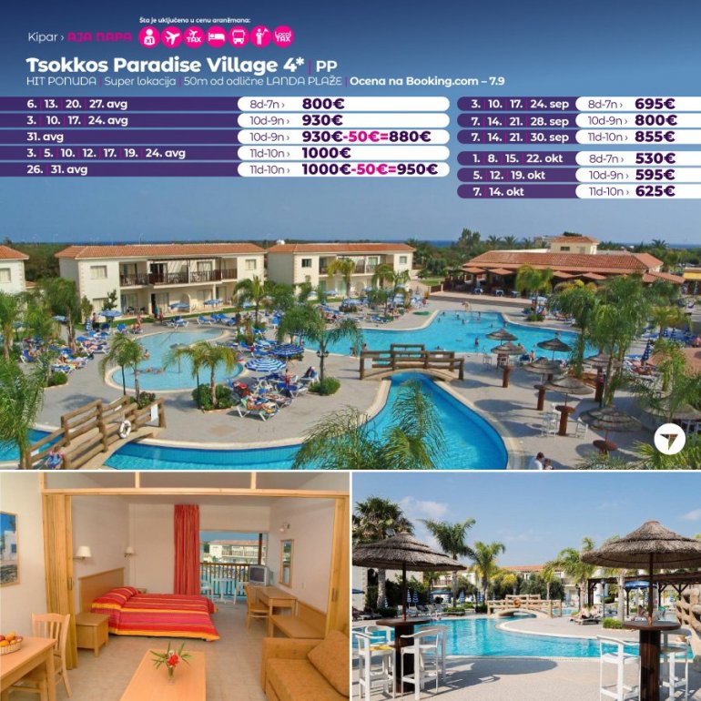 Ovo odmaralište sa 4 zvezdice nalazi se u letovalištu Aja Napa. Nudi zatvoreni bazen, fitnes centar, saunu i otvoreni bazen nepravilnog oblika, okružen nameštenom terasom za sunčanje. Sadržaji odmarališta Tsokkos Paradise takođe obuhvataju restoran-bar pored bazena, igraonicu sa bilijarom, teniski teren i mini-market.