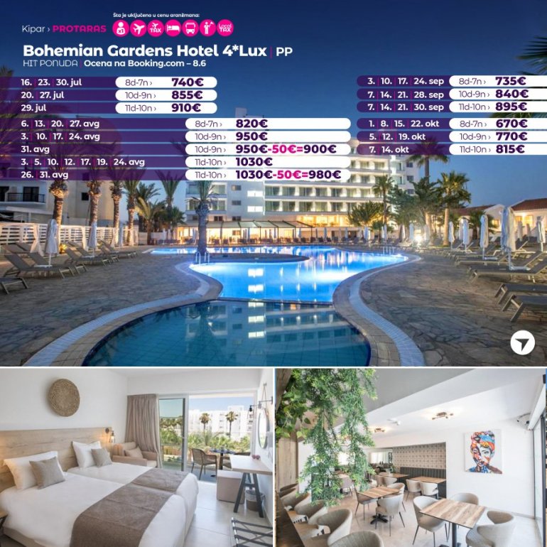 Hotel je smešten u blizini Marlita Bay, u delu Protarasa koji se zove Pernera – jedan od najživljih delova ovog grada. Bohemian Gardens Hotel sa 4* je zgrada sa 5 spratova, sa 133 sobe i 8 bungalova. Hotel je otvoren u julu 2020. godine i uređen je u boho stilu.