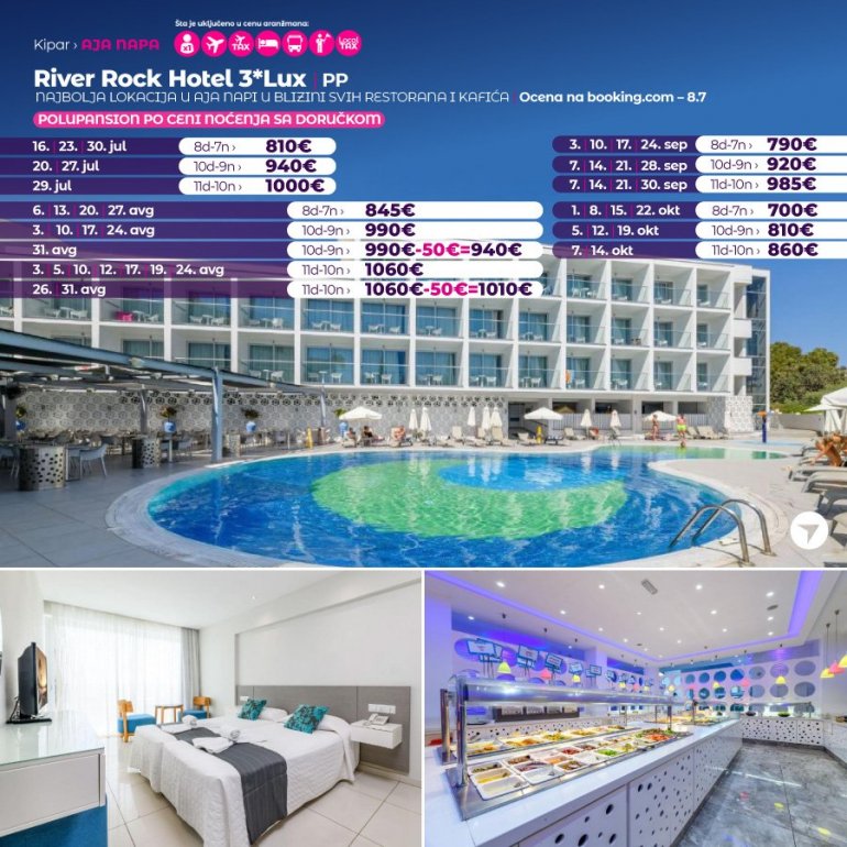 Hote River Rock nalazi se u mestu Aja Napa i poseduje otvoreni bazen i terasu za sunčanje. Na raspolaganju je dečije igralište, a besplatan bežični internet je dostupan u celom objektu. Sve sobe nude balkon sa pogledom na grad. Pored toga sadrže flat-screen TV i klima-uređaj. Gostima je na raspolaganju sopstveno kupatilo sa tušem i fenom za kosu. Dodatne pogodnosti uključuju sef, frižider i posteljinu. Ponuda hotela River Rock uključuje recepciju koja radi non-stop, vrt i bar.