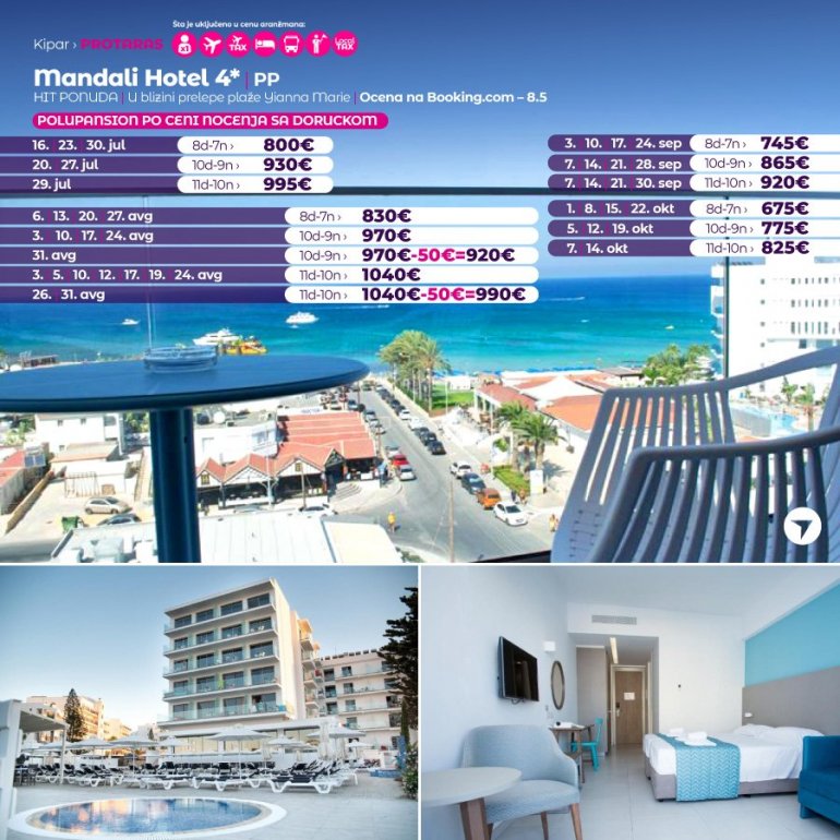 Ovaj objekat je udaljen 4 min hoda od peskovite plaže u Protarasu. Takođe, hotel poseduje i spoljašnji i unutrašnji bazen sa ležaljkama. Svaka soba u Mandali hotelu sadrži: ketler, mini frižider, tv i privatni balkon. U kupatilima se nalazi fen. U hotelu je dostupan restoran sa lokalnim specijalitetima. Pored bazena se nalazi bar. Na ulazu u hotel se nalazi supermarket gde možete pronaći sve namirnice za pripremanje hrane. Popularna plaža Fig Tree se nalazi na 1km od hotela, grad Agia Napa je udaljen 12km dok je aerodrom u Larnaki udaljen 45km. Hotel pruža besplatno parking mesto.