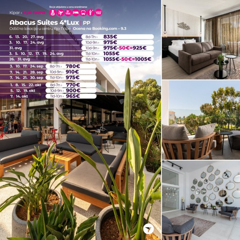 bacus Suites je potpuno nov hotel, sa najvišim ocenama na turističkim portalima. Izuzetno je lociran, na nekoliko minuta hoda od centra Aja Nape i plaže. U neposrednoj blizini hotela nalaze se restorani, kafići, barovi, prodavnice i stanica gradskog prevoza. Idealan je izbor kako za parove, tako i za porodice, zbog prostranih soba i usluge koja može biti polupansion ili all inclusive.