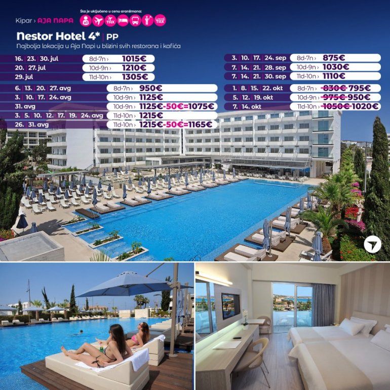 Moderan i u potpunosti renoviran hotel Nestor, odlično je pozicioniran na samo nekoliko minuta šetnje do prelepe peščane plaže, marine i centra Aja Nape. Visoko je ocenjen na turističkim potralima i dobitnik je prestižne plakete za visok kvalitet usluge. Hotel od sadržaja ima: veliki spoljašnji bazen sa masažerima, unutrašnji bazen, teretanu, saunu, parno kupatilo, stoni tenis, teniski teren, bilijar, frizerski salon, dnevnu i večernju animaciju za odrasle, sadržaje za decu – bazen, avantura park, rane obroke, animaciju, mini klub. Sobe su moderno opremljene, klimatizovane, imaju radio, fen, telefon, SAT LCD TV, frižider, sef, aparat za čaj i kafu, wi-fi internet (dostupan i besplatan u celom hotelu).