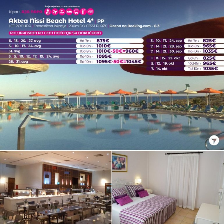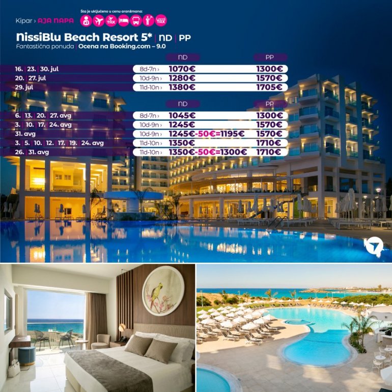 Nissiblu je nov, luksuzan hotel, otvoren pred sezonu 2019 god. Nalazi se u laguni Nisi plaže, najpoznatije plaže u Aja Napi, na oko 2 km od centra grada. Posle samo jedne sezone poslovanja, hotel je vrlo visoko ocenjen na turističkim portalima. Pohvale od strane zadovoljnih klijenata se, osim savršene lokacije, odnose i na izvanrednu hranu, atmosferu, udobne sobe i ljubazno, stručno osoblje. Hotel je preporuka naše agencije kako za parove, tako i za porodice sa decom.