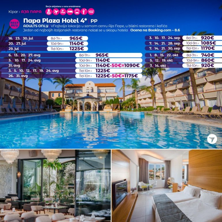 Ovo je moderan i atraktivan hotel sa četiri zvezdice u srcu Aja Nape. Namenjen je samo odraslim gostima, a izgrađen je 1989. godine u blizini srednjovekovnog manastira. Ovaj centralno locirani savremeni i jedinstveni hotel koji je sagrađen u stilu trga nudi gostima privatnost, prefinjenost i personalizovanu uslugu, što se i očekuje od višestruko nagrađivanog sofisticiranog okruženja prilagođenog odraslima. Hotel je udaljen 7 minuta hoda od najbliže gradske plaže, kilometar od popularne Grecian bay plaže, 3 km od Nissi plaže i 4,5 km do Waterworld vodenog parka. Objekat se nalazi u samom centru Aja Nape, okružen prodavnicama, kafićima i restoranima. Autobuska stanica i stari Manastir su u neposrednoj blizini, a nedaleko su i muzej Thalassa, podvodni muzej Musan, park skulptura i kaktusa.