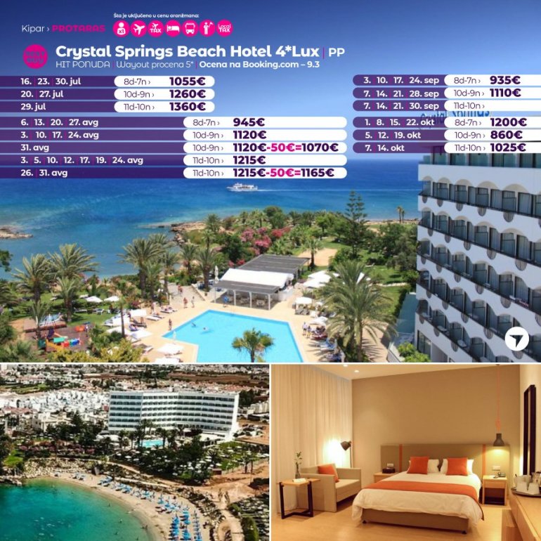 Hotel se nalazi u blizini živopisne ribarske luke, na 5 km od Protarasa. Gostima su u okviru hotela na raspolaganju otvoreni bazen, zaseban dečiji bazen i sobe sa nameštenim balkonom i pogledom na Sredozemno more. Sve sobe hotela Crystal Springs Beach su klimatizovane i svetle. Ponuda restorana Salamina obuhvata tematske večeri, internacionalne specijalitete, regionalnu hranu i poseban dečiji meni.