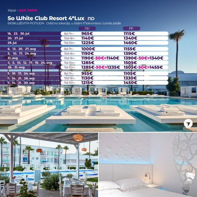 Objekat So White Club Resort nalazi se na predivnoj Zlatnoj plaži u letovalištu Aja Napa. U ponudi su bazen u stilu lagune sa plutajućim ležaljkama i nagrađivani restoran. Ovaj butik hotel u Aja Napi je dizajnirao jedan od najboljih 50 dizajnera na svetu. Pored zadivljujućih tropskih vrtova nalazi se potpuno beo bazen, koji može menjati boje, sa jedinstvenim efektom neba u pozadini. Na plaži su dostupni sportovi na vodi, gnjuranje i ronjenje. Kosmopolitski centar noćnog života Aja Nape nalazi se na samo 3,5 km od hotela i do njega se lako i brzo stiže autobusom i taksijem.