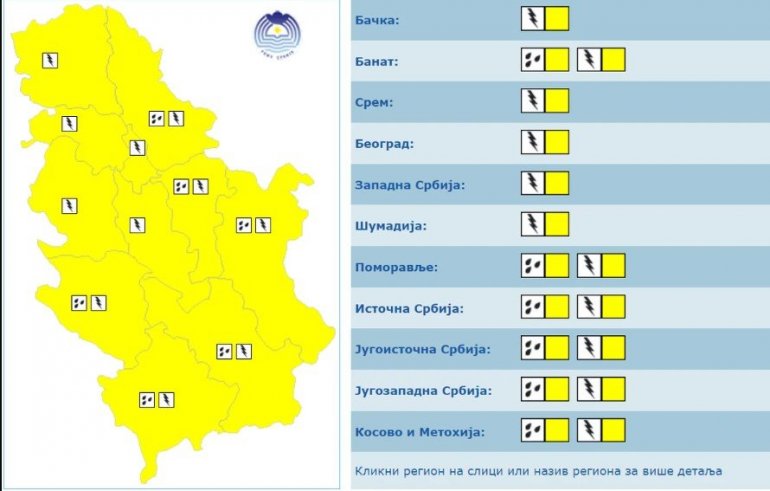 Na sajtu RHMZ-a objavljeno je meteorološko upozorenje, koje navodi da će pljuskovi sa grmljavinom biti još danas lokalno intenzivni uz pojavu grada i uz izrazito neujednačenu količinu padavina. Prognoza je urađena jutros u 4.45 i predviđa vreme za današnji dan. Od sutra se, kako navode, očekuje stabilizacija vremena.