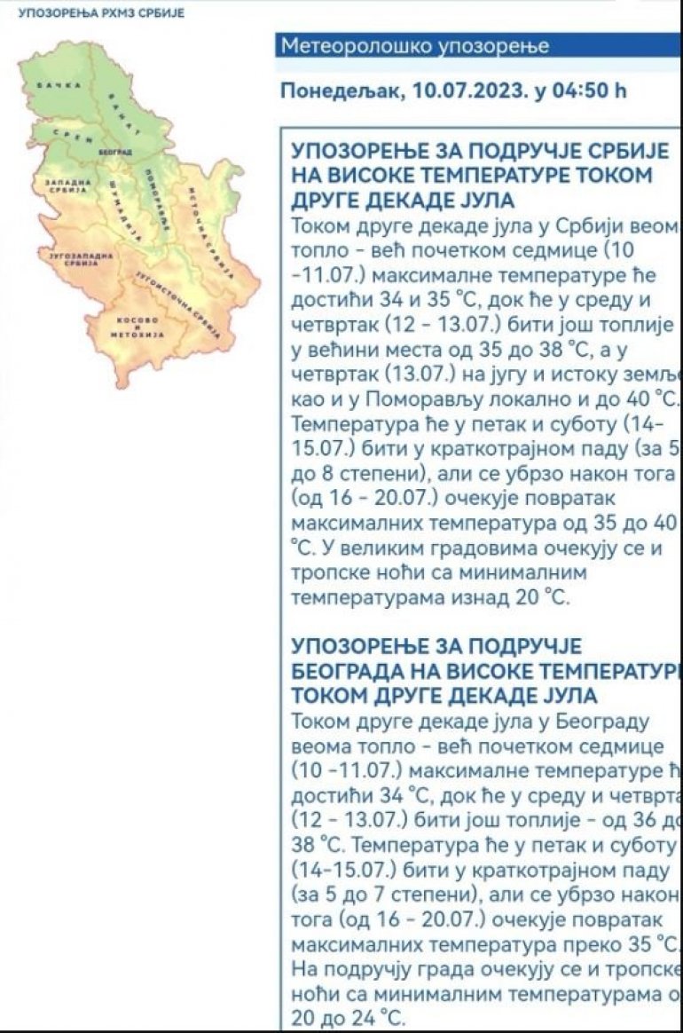REPUBLIČKI hidrometeorološki zavod (RHMZ) upozorio je da će tokom druge dekade jula u Srbiji biti veoma toplo.