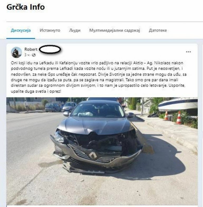 Robert iz Zrenjanina podelio je unutar Fejsbuk grupe "Grčka info" fotografiju sa pratećim tekstom o nezgodi koju je doživeo na putu ka Lefkadi. Naime, njemu je pred automobil izletela ogromna divlja svinja, koja mu je totalno havarisala prednju stranu automobila, zbog čega je apelovao na sve vozače da se pridržavaju pravila u saobraćaju, kao i da stalno budu na oprezu tokom vožnje.