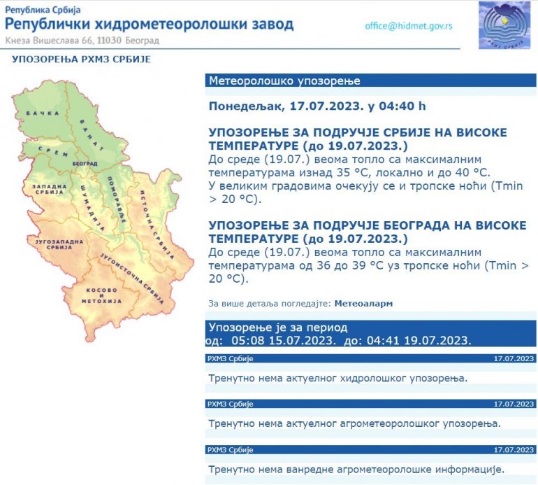 REPUBLIČKI hidrometeorološki zavod (RHMZ) objavio je upozorenje da nas do srede čeka veoma toplo vreme sa maksimalnom temperaturom iznad 35 stepeni, a lokalno će se živa peti i do 40. podeljka, pa je za danas na snazi crveni meteo-alarm.