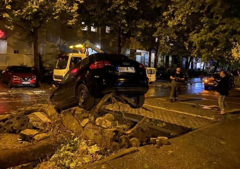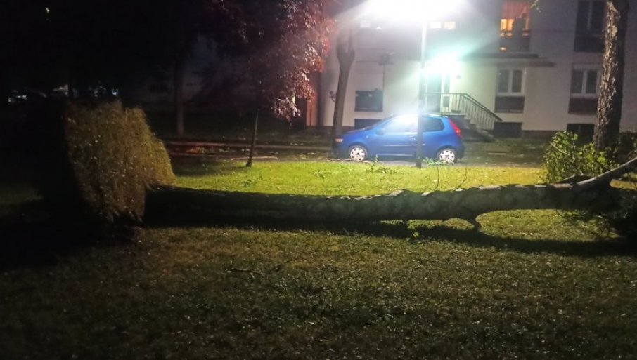 Kako se vidi na fotografijama, jaki udari vestra su oborili drveće po putu i na parking prostoru. Stanovnicima se savetuje da ne izlaze vani i potšuju savete MUP-a.