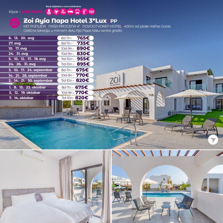 Predstavljamo vam hotel koji sredinom juna otvara svoja vrata za goste. U pitanju je potpuno nov hotel na odlicnoj lokaciji. Nalazi se u Aja Napi, na 15 minuta setnje od centra ovog mesta i u blizini plaze Vathia Gonia. U blizini hotela nalazi se brojni restorani, barovi i stanica gradskog prevoza. Hotel poseduje WiFi, bar kod recepcije, spoljasnji bazen i teretanu. Sobe su moderno opremljene, sa AC uređajem.