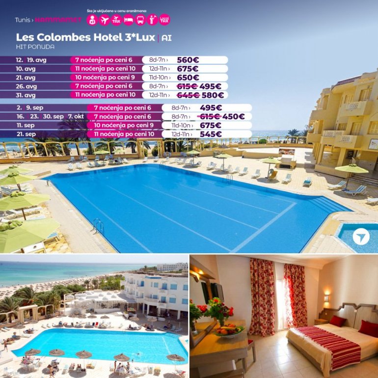 Les Colombes 3* Lux je hotel sa 3* koji je smešten u Hammametu, u turističkoj zoni. Hotel se nalazi na 15min od Neapolis muzeja. Za goste je dostupna teretana. U objektu je dostupna recepcija 24h. Za najmlađe goste tu je klub za decu. Pored plaže, gosti mogu da uživaju i na spoljnom bazenu.Hotel izlazi na svoju plažu.Svaka soba u hotelu je klimatizovana, ima svoje kupatilo i mini bar.Kod recepcije se nalazi lobby bar. Obroci iz usluge All inclusive se služe u glavnom restoranu.