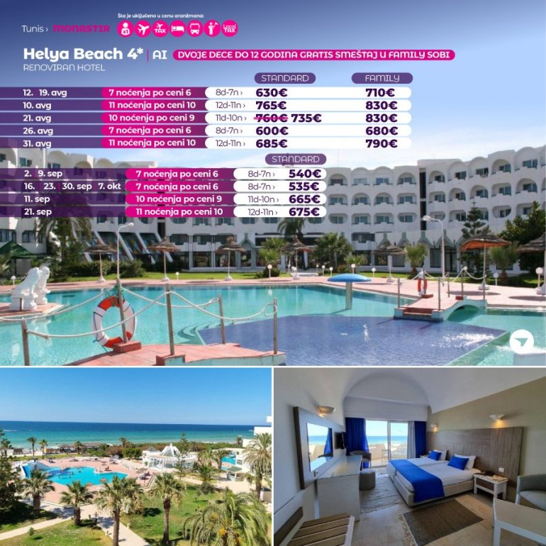 Ovaj hotel se nalazi ispred plaže Skane-Monastir i raspolaže prelepim pogledom na Sredozemno more. Smeštaj sa 4 zvezdice obuhvata privatnu terasu, a hotel takođe poseduje 4 bazena i spa centar. Sve sobe hotele Helya Beach Resort nedavno su renovirane i obuhvataju sopstveno kupatilo, klima-uređaj i TV sa satelitskim kanalima. Hotel Helya raspolaže mnogim barovima i restoranima. Sa izborom šou kuvanja u restoranu Rubis, picerije Le Safir, hamburgera i krompirića u restoranu Barbeque, svaki gost će pronaći nešto za sebe. Spa centar Thalasso Biocure nudi moderne zdravstvene i wellness sadržaje na preko 300 m². Centar obuhvata hamam, saunu, škotski tuš, kadu sa podvodnom masažom, kabinu Vichy, mlazni tuš, tretmane lica i tela algama, kao i antistres masaže. Hotel se može pohvaliti sa 4 bazena. Dva su na otvorenom i namenjena odraslim osobama, a tu su i otvoreni bebi bazen i grejani bazen. Gostima je na raspolaganju takođe fitnes centar. Možete koristiti teniske terene, terene za odbojku, rukomet, košarku i mini-golf, a tu je i dnevni zabavni program.