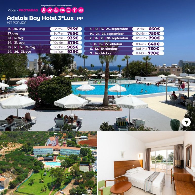 Hotel Adelais Bay udaljen je 500m od plaže Green bay, plaža koja se nalazi između čuvene Fig Tree plaže i Konnos plaže. Hotelski prostor pokriva velika bašta sa otvorenim bazenom. Sobe su klimatizovane sa SAT TV i balkonom ili terasom. Svaka soba poseduje sopstveno kupatilo sa fenom za kosu. U sastavu hotela je Aurora restoran i bar Ilios pored bazena. Opremljen je sa igralištem na otvorenom sa stolicama za ljuljanje i igraonicom, dok se uz doplatu može obezbediti usluga čuvanja dece. Grad Protaras udaljen je od hotela 15 minuta hoda.