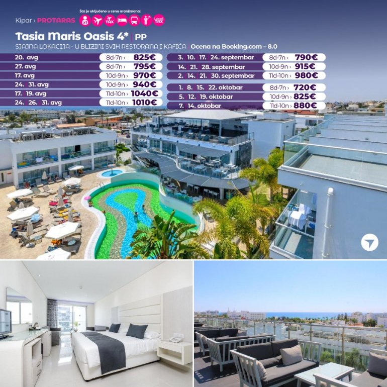 Smešten na padini, na samo 5 minuta hoda od centra Aja Nape, objekat Tasia Maris Oasis nudi moderno uređene smeštajne jedinice sa besplatnim bežičnim internetom i sopstvenim balkonom. Uključuje bazen slobodnog oblika, 2 restorana i 2 bara. Grčka plaža, najveća peščana plaža u Aja Napi, udaljena je samo 10 minuta hoda. Na pešačkoj udaljenosti nalaze se restorani, barovi i prodavnice. Parking u okviru objekta može se besplatno koristiti.
