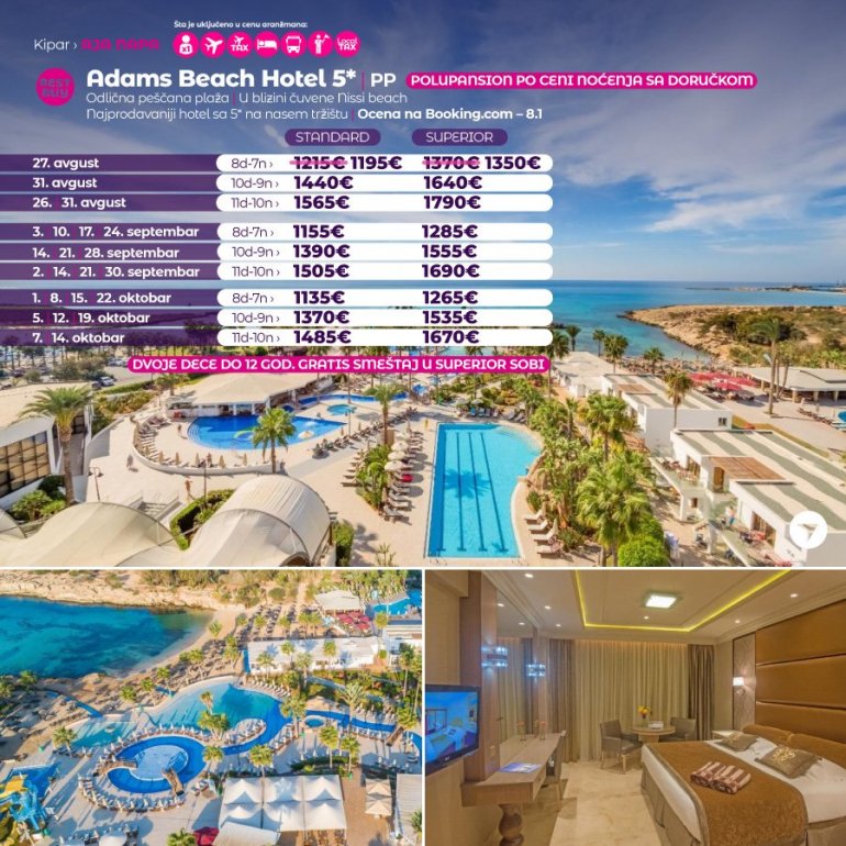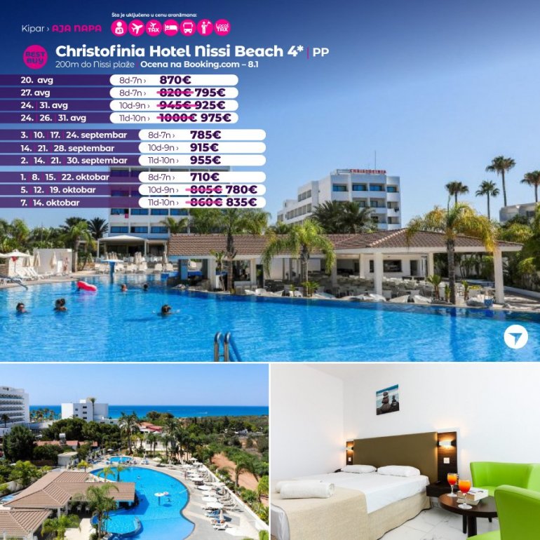 Otmen i elegantan hotel, smešten je na jednoj od najlepših peščanih plaža u regiji, u samom centru Protarasa, 47km od aerodroma u Larnaki. Sve sobe, prostor oko bazena i restoran, renovirani su u potpunosti pred sezonu 2018. god. Od sadržaja hotel ima veliki spoljašnji bazen sa delom za decu, zatvoreni bazen, glavni restoran, a la carte restoran, bar u lobiju, koktel barove na plaži i pored bazena, prodavnicu suvenira, salon lepote, frizera, stoni tenis, animaciju, saunu, teretanu, parno kupatilo i teniski teren. Sobe su prostrane, sa balkonom, imaju SAT TV, telefon, fen, sef, mini frižider, ketler, wi-fi internet. U sobama upotreba sefa, frižidera i interneta dodatno se naplaćuje.