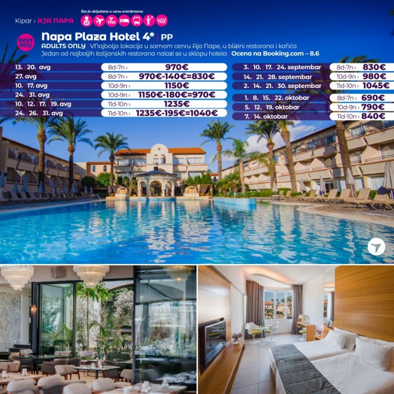 Ovo je moderan i atraktivan hotel sa četiri zvezdice u srcu Aja Nape. Namenjen je samo odraslim gostima, a izgrađen je 1989. godine u blizini srednjovekovnog manastira. Ovaj centralno locirani savremeni i jedinstveni hotel koji je sagrađen u stilu trga nudi gostima privatnost, prefinjenost i personalizovanu uslugu, što se i očekuje od višestruko nagrađivanog sofisticiranog okruženja prilagođenog odraslima. Hotel je udaljen 7 minuta hoda od najbliže gradske plaže, kilometar od popularne Grecian bay plaže, 3 km od Nissi plaže i 4,5 km do Waterworld vodenog parka. Objekat se nalazi u samom centru Aja Nape, okružen prodavnicama, kafićima i restoranima. Autobuska stanica i stari Manastir su u neposrednoj blizini, a nedaleko su i muzej Thalassa, podvodni muzej Musan, park skulptura i kaktusa.