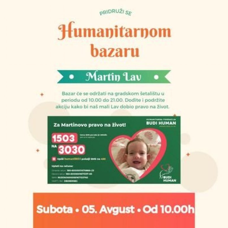U SUBOTU, 5. avgusta, na gradskom šetalištu u Vranju, od 10 do 21 čas, biće održan celodnevni humanitarni bazar za lečenje malog Martina Lava.
