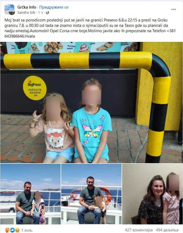 "Moj brat sa porodicom, poslednji put se javili na granici Preševo 6.8.u 22:15 časova, a prešli na grčku granicu 7.8. u 00:30. Od tada ne znamo ništa o njima.Uputili su se na Tasos gde su planirali da nađu smeštaj. Automobil "opel korsa" crne boje. Molimo javite ako ih prepoznate na telefon +381 643986646.Hvala" - napisala je ona.