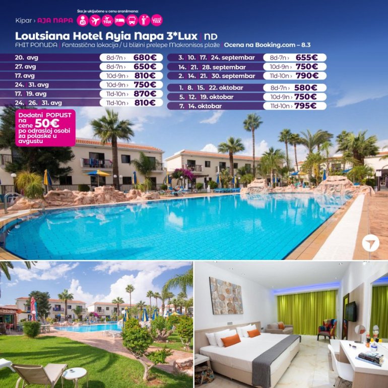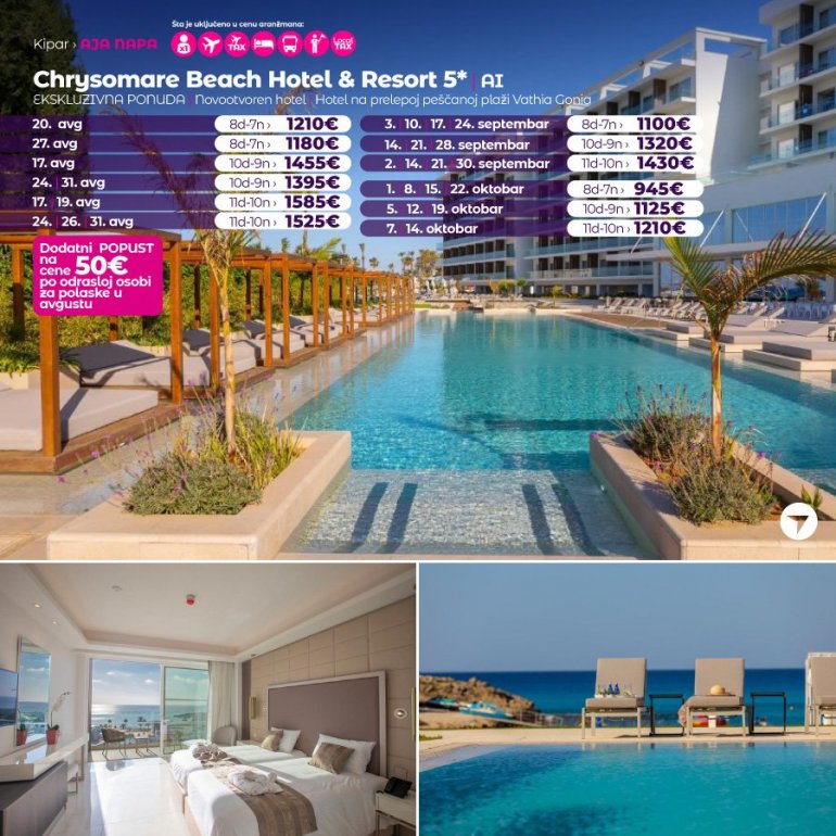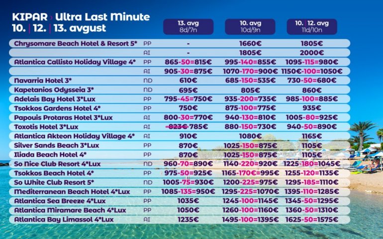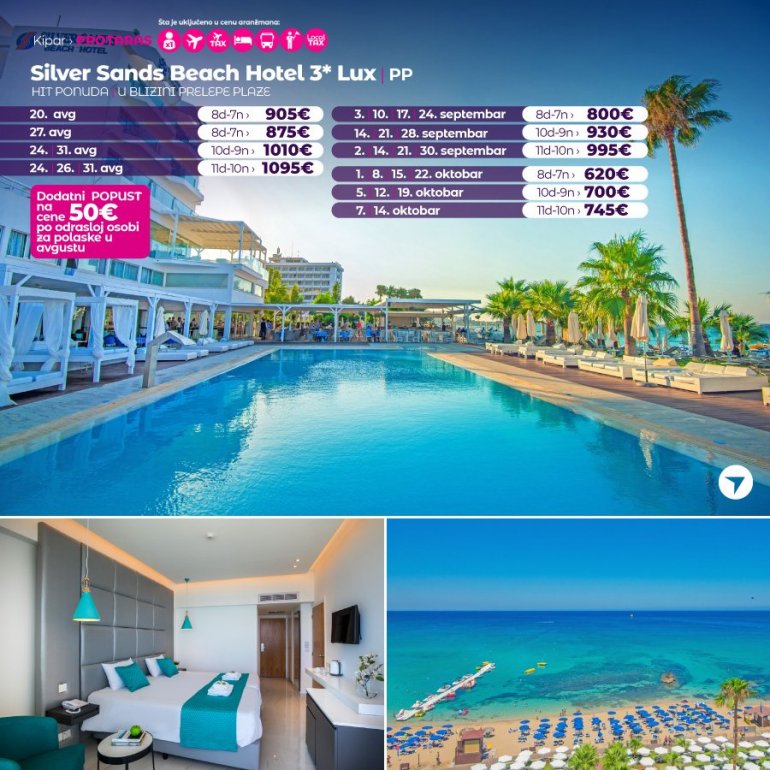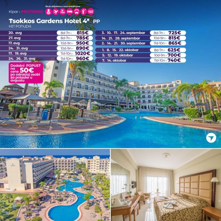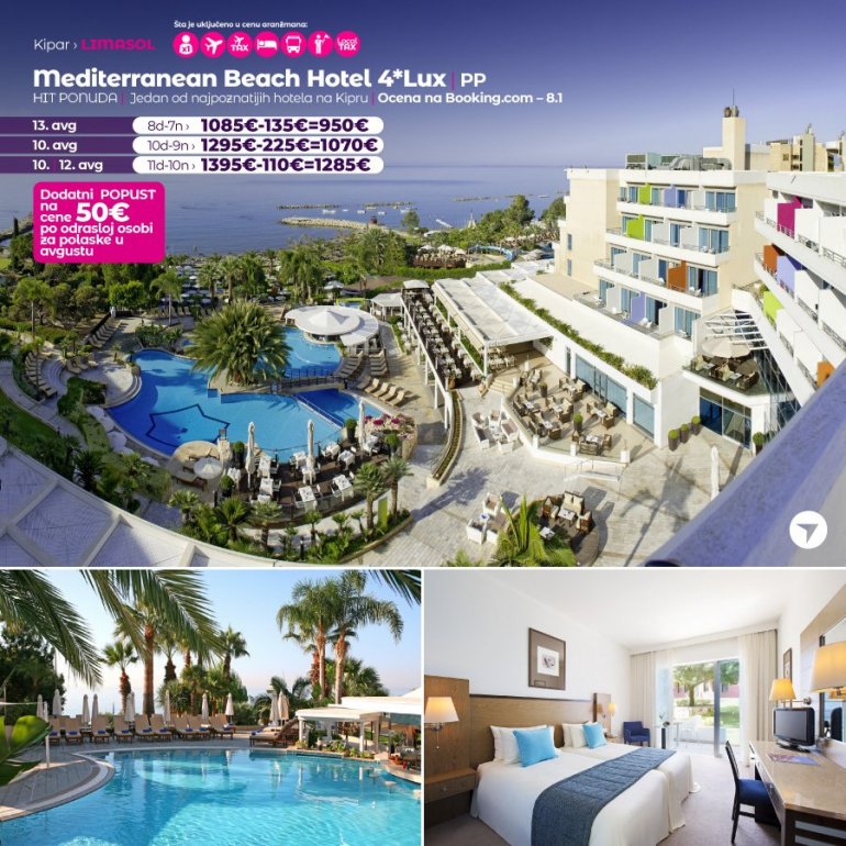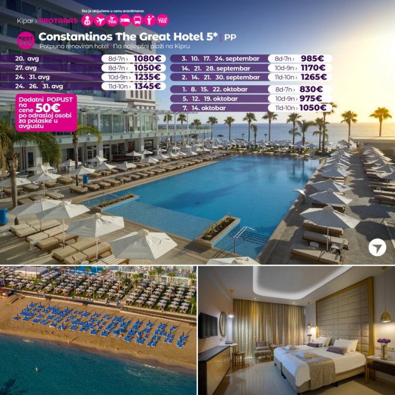 Definitivno nova omiljena letnja destinacija naših turista svakako jeste rajsko ostrvo Kipar. Osetite čari Mediterana, fantastičnih plaža, veoma kvalitetnih hotela, izuzetne gastronomske ponude, kao i nezaboravnog noćnog provoda. Za naše putnike smo spremili odličnu first minute ponudu sa pažljivo izabranim hotelima, kako na osnovu pređašnjih iskustava naših klijenata, tako i na osnovu odličnih ocena na turističkim portalima.