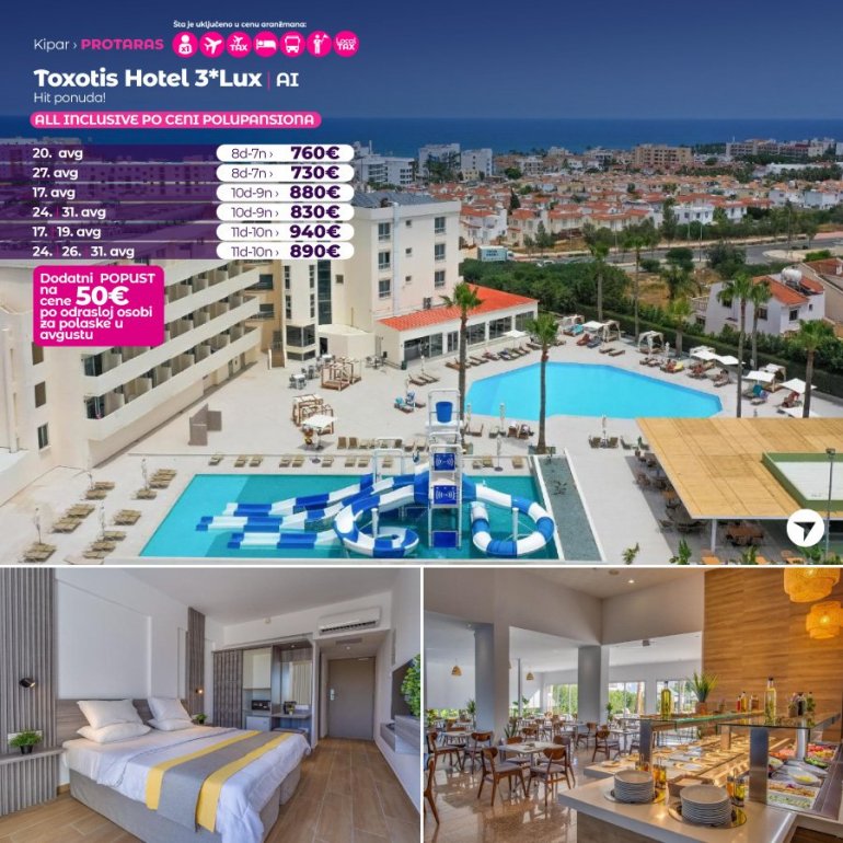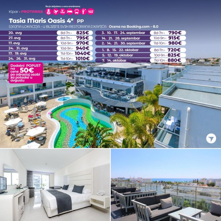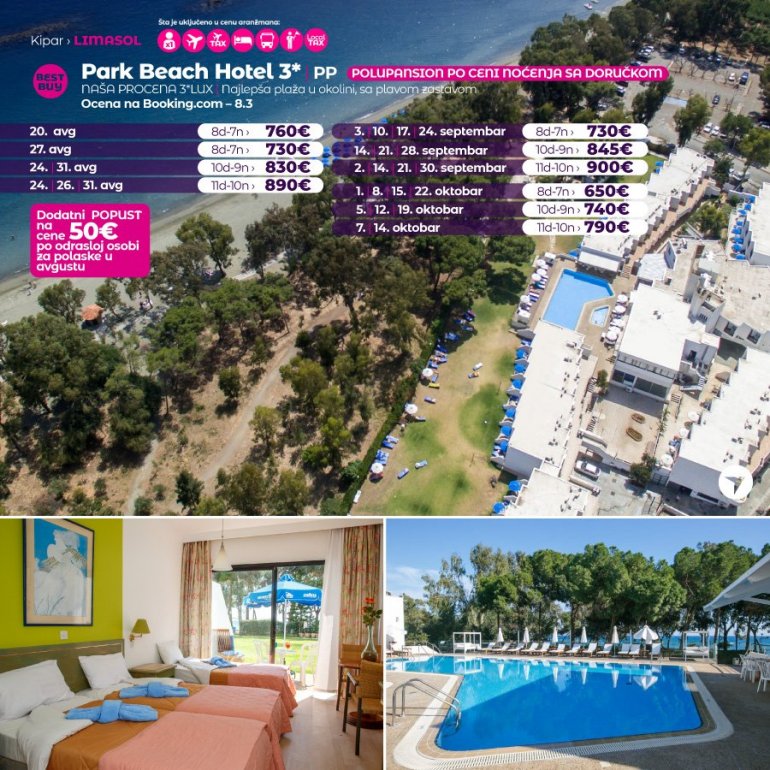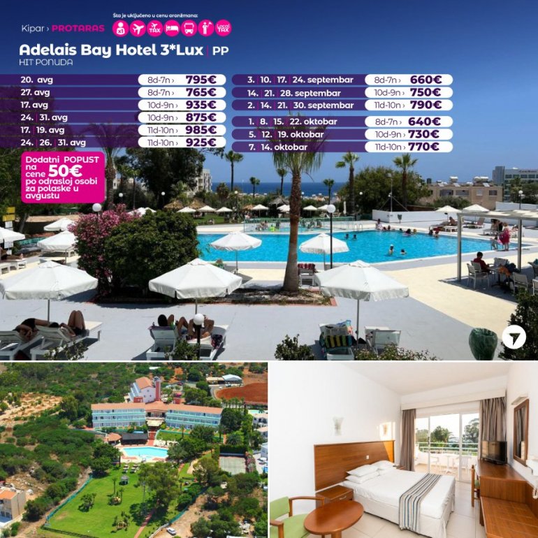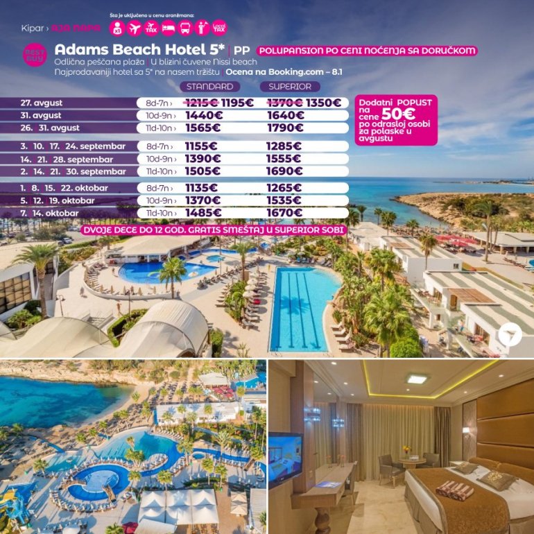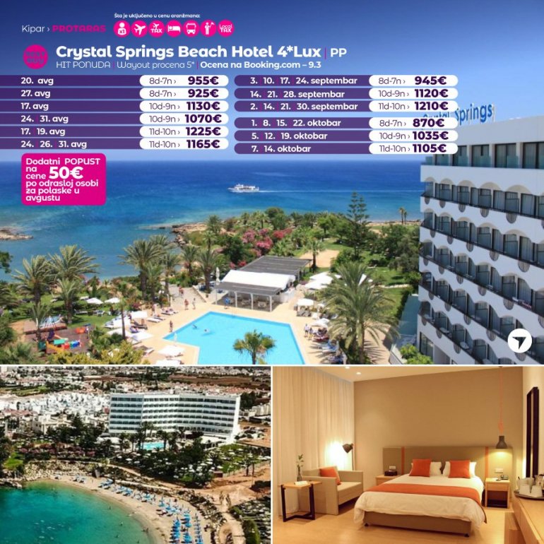 Definitivno nova omiljena letnja destinacija naših turista svakako jeste rajsko ostrvo Kipar. Osetite čari Mediterana, fantastičnih plaža, veoma kvalitetnih hotela, izuzetne gastronomske ponude, kao i nezaboravnog noćnog provoda. Za naše putnike smo spremili odličnu first minute ponudu sa pažljivo izabranim hotelima, kako na osnovu pređašnjih iskustava naših klijenata, tako i na osnovu odličnih ocena na turističkim portalima.