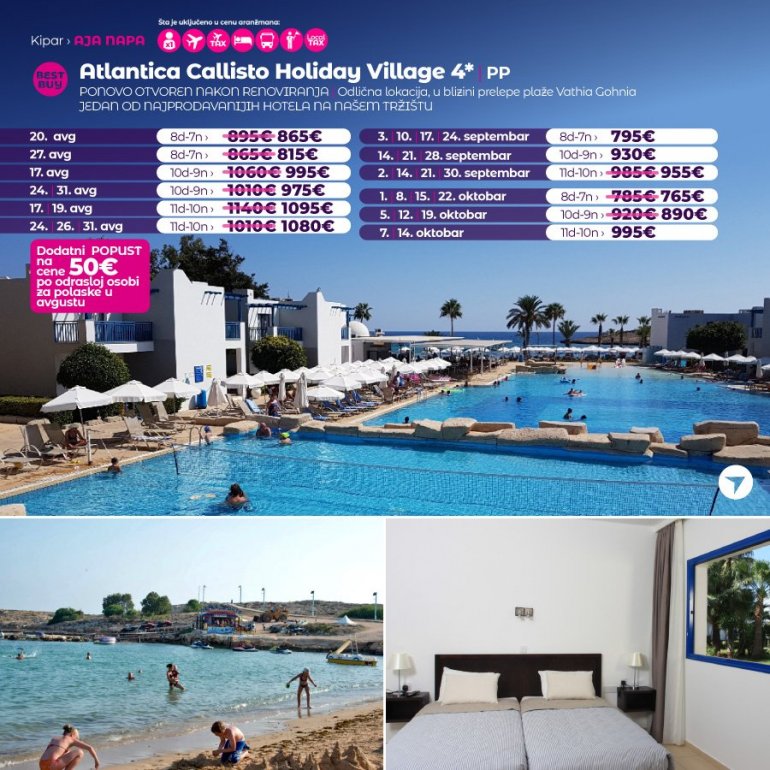 Callisto je kompleks osmišljen kao kopija tradicionalnog mediteranskog sela sa belim dvospratnim vilama plavih šalona, prozora i vrata. Vile su okružene egzotičnim drvećem i cvećem, povezane uzanim stazama sa centralnim delom hotela, u kome se nalazi restoran, recepcija, bezeni i prolaz do prelepe peščane plaže. Idealan izbor za porodice sa decom i sve ostale koji uživaju u raskošnoj prirodi, a na nekoliko minuta hoda od glavne ulice poznatog letovališta Aja Napa. Centar grada udaljen je 1,5 km. Besplatan ulaz u akva-park nedaleko od hotela!