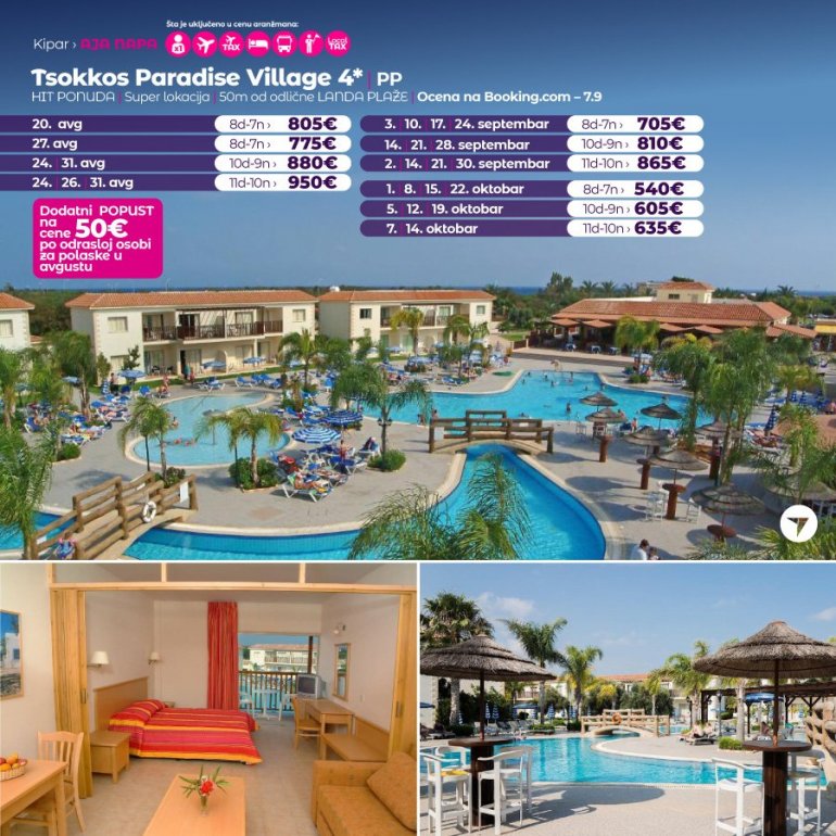 Ovo odmaralište sa 4 zvezdice nalazi se u letovalištu Aja Napa. Nudi zatvoreni bazen, fitnes centar, saunu i otvoreni bazen nepravilnog oblika, okružen nameštenom terasom za sunčanje. Sadržaji odmarališta Tsokkos Paradise takođe obuhvataju restoran-bar pored bazena, igraonicu sa bilijarom, teniski teren i mini-market.
