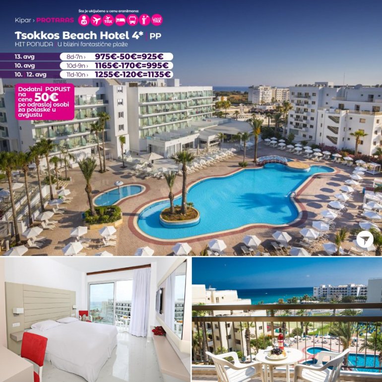 Na samo 150 m od plaže, u centru Protarasa, nalazi se hotel Tsokkos Beach. Okružen je mnogobrojnim restoranima, prodavnicama i barovima, a pešačka staza uz more prolazi ispred hotela. Osim glavnog restorana, u kome se služe obroci po principu švedskog stola, hotel ima i kafeteriju, bar na bazenu, bazen za odrasle, bazen za decu, salu za video-igrice, teretanu, animaciju tokom dana i večeri, teniski teren. Sve sobe su moderno opremljene, uz doplatu je bežični internet, korišćenje elektronskog sefa i mini-frižidera.
