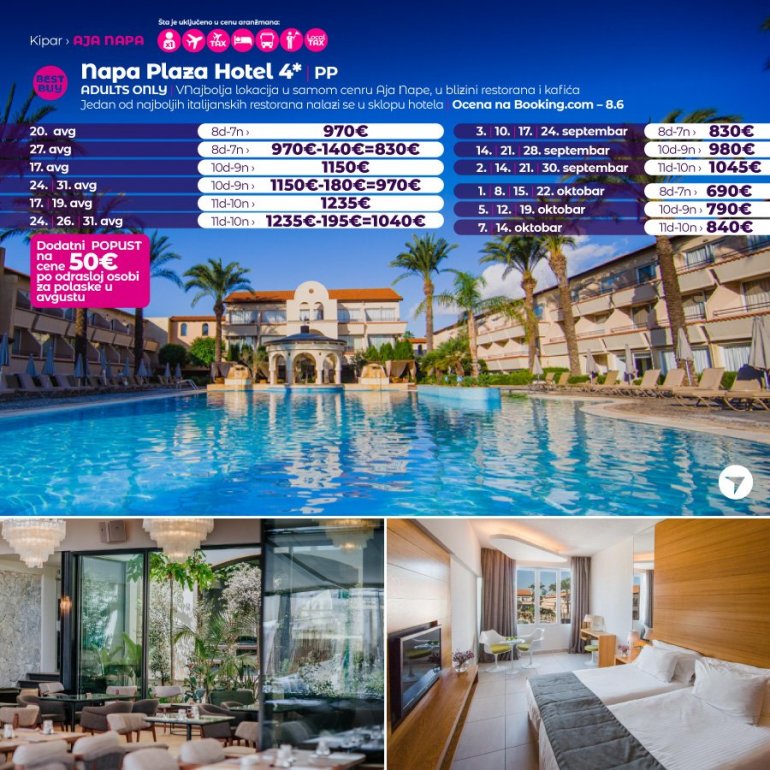 Ovo je moderan i atraktivan hotel sa četiri zvezdice u srcu Aja Nape. Namenjen je samo odraslim gostima, a izgrađen je 1989. godine u blizini srednjovekovnog manastira. Ovaj centralno locirani savremeni i jedinstveni hotel koji je sagrađen u stilu trga nudi gostima privatnost, prefinjenost i personalizovanu uslugu, što se i očekuje od višestruko nagrađivanog sofisticiranog okruženja prilagođenog odraslima. Hotel je udaljen 7 minuta hoda od najbliže gradske plaže, kilometar od popularne Grecian bay plaže, 3 km od Nisi plaže i 4,5 km do Waterworld vodenog parka. Objekat se nalazi u samom centru Aja Nape, okružen prodavnicama, kafićima i restoranima. Autobuska stanica i stari Manastir su u neposrednoj blizini, a nedaleko su i muzej Thalassa, podvodni muzej Musan, park skulptura i kaktusa.