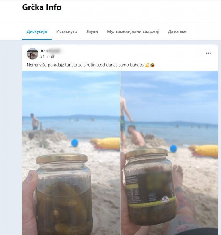Naime, u Fejsbuk grupi Grčka Info jedan Aca objavio je dve fotografije na kojima se vidi šta je odlučio da ponese sa sobom na plažu kad bude došlo vreme užine. Malo ko bi očekivao da će to biti tegla kiselih krastavčića, i to onih kvalitetnijih!