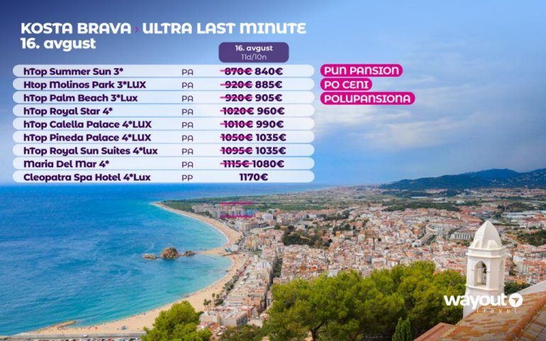 KOSTA Brava je definitivno mesto u Španiji koje valja posetiti, posebno zbog neodoljive ultra last minute ponude ili letnje rasprodaje pojedinih hotela koji nude uslugu punog pansiona po ceni polupansiona.
