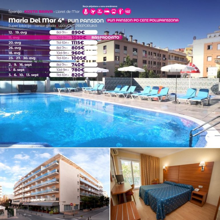 Ovaj objekat je udaljen 5 min hoda od plaže. Hotel sa 4 zvezdice Maria del Mar smešten je u centru Ljoret de Mara, na samo 300 metara od plaže. Raspolaže zatvorenim i otvorenim bazenima, kao i sunčanom terasom. Sve klimatizovane sobe u hotelu Maria del Mar nude TV sa satelitskim kanalima, balkon i fen za kosu. Smeštajne jedinice imaju sopstveno kupatilo. Ponuda hotela Maria del Mar obuhvata takođe TV salon, turistički desk i recepciju koja radi non-stop. Tokom leta se organizuje zabavni program za decu i odrasle. U hotelskom gril restoranu služe se jela sa menija i na bazi švedskog stola, koja se pripremaju pred gostima. Gostima su na raspolaganju kafe i bar pored bazena sa živom muzikom. Autobuska stanica je udaljena samo 100 metara. Hotel se nalazi na 200 metara od raznovrsnih prodavnica i restorana.