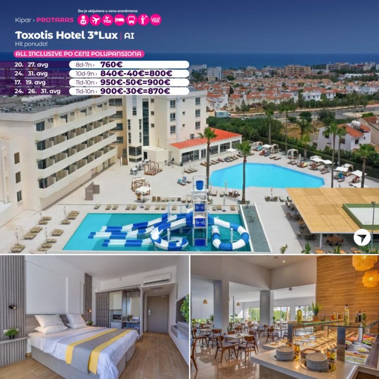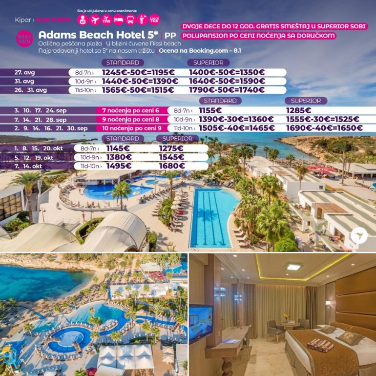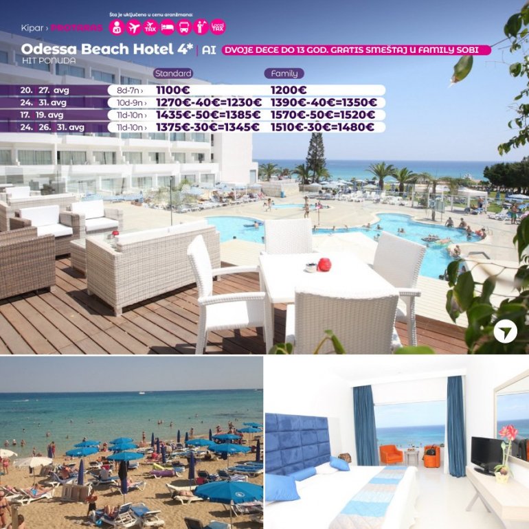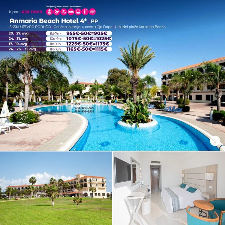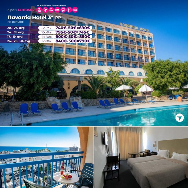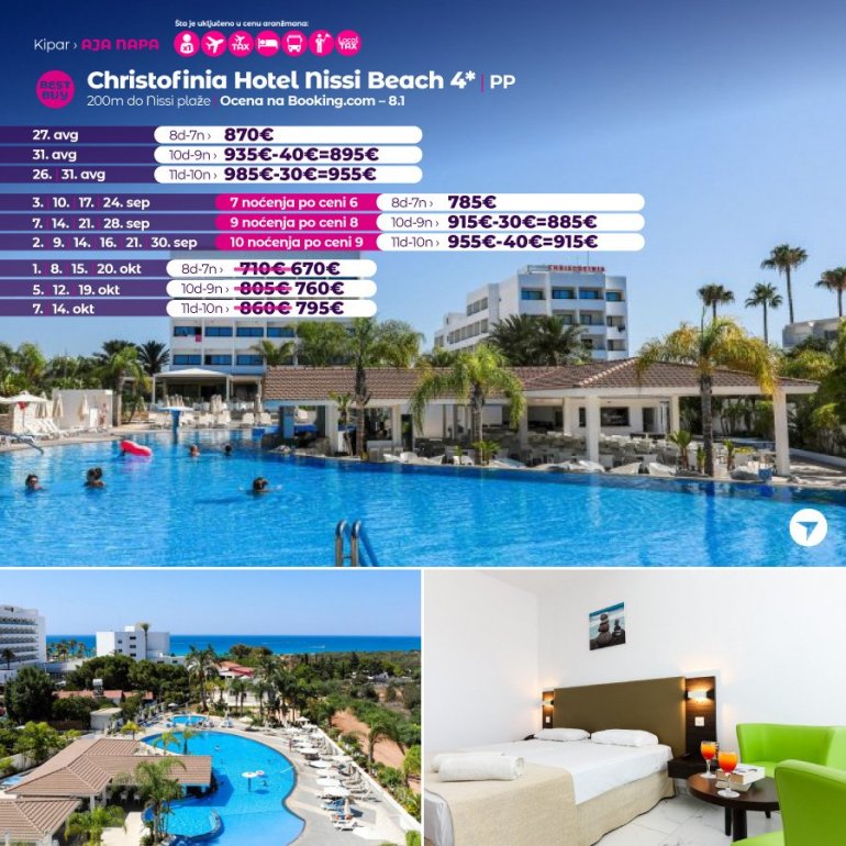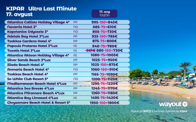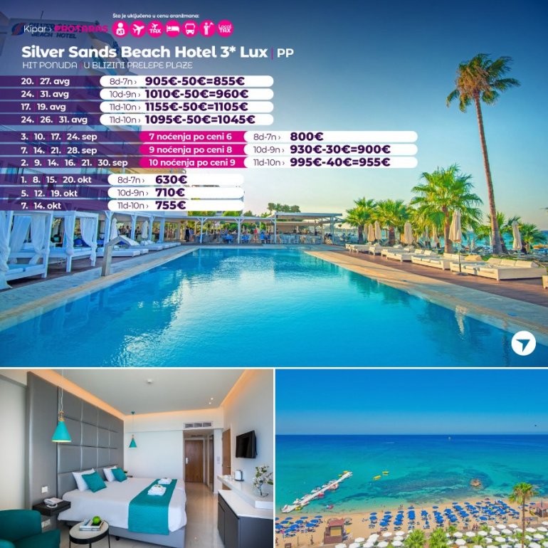 Definitivno nova omiljena letnja destinacija naših turista, svakako jeste rajsko ostrvo Kipar. Osetite čari Mediterana, fantastičnih plaža, veoma kvalitetnih hotela, izuzetne gastronomske ponude, kao i nezaboravnog noćnog provoda. Za naše putnike smo spremili odličnu first minute ponudu sa pažljivo izabranim hotelima, kako na osnovu pređašnjih iskustava naših klijenata, tako i na osnovu odličnih ocena na turističkim portalima.