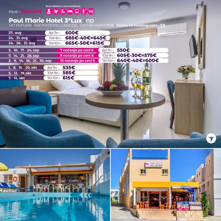 Objekat Paul Marie Hotel Apartments je smešten u centru letovališta Aja Napa i raspolaže restoranom i krovnim bazenom na otvorenom. WiFi je dostupan u zajedničkim prostorijama. Studiji i apartmani u objektu Paul Marie Hotel sadrže prostor za sedenje i balkon sa pogledom na vrt. Osim toga, imaju čajnu kuhinju sa pločama za kuvanje i posuđem. Kupatila u smeštajnim jedinicama su opremljena fenom za kosu i tušem. Objekat Paul Marie Hotel Apartments takođe nudi snek bar i recepciju koja radi non-stop. Međunarodni aerodrom Larnaka je udaljen oko 60 km. Ponuda objekta obuhvata i besplatan parking.