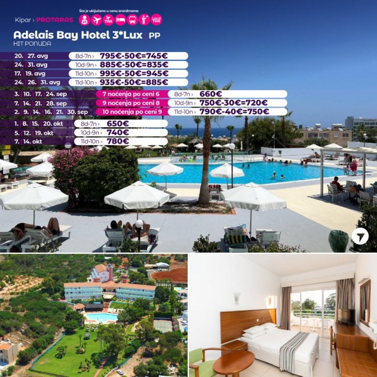 Hotel Adelais Bay udaljen je 500m od plaže Green bay, plaža koja se nalazi između čuvene Fig Tree plaže i Konnos plaže. Hotelski prostor pokriva velika bašta sa otvorenim bazenom. Sobe su klimatizovane sa SAT TV i balkonom ili terasom. Svaka soba poseduje sopstveno kupatilo sa fenom za kosu. U sastavu hotela je Aurora restoran i bar Ilios pored bazena. Opremljen je sa igralištem na otvorenom sa stolicama za ljuljanje i igraonicom, dok se uz doplatu može obezbediti usluga čuvanja dece. Grad Protaras udaljen je od hotela 15 minuta hoda.