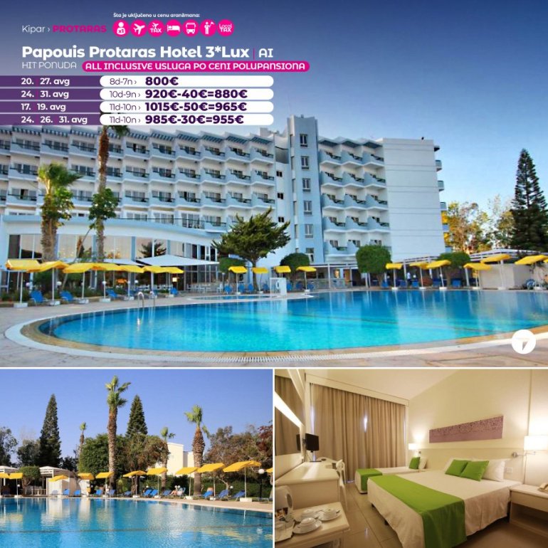 Odličan hotel, lociran nedaleko od centra Protarasa, na najlepšem delu dugačke peščane plaže. Od sadržaja hotel ima restoran, bar, spoljašnji bazen, dečiji bazen, teniski teren, teretanu, animaciju tokom dana i večeri, muzički program. Sve sobe su klimatizovane, imaju TV, fen, telefon, a uz doplatu mogu se koristiti frižider, sef i wi-fi internet.
