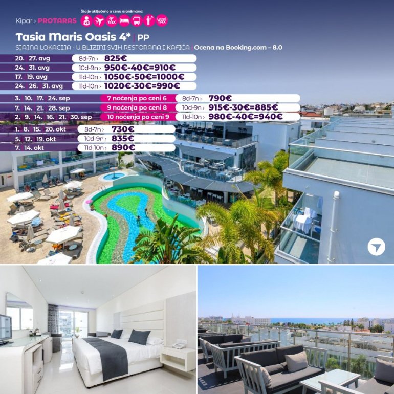 Smešten na padini, na samo 5 minuta hoda od centra Aja Nape, objekat Tasia Maris Oasis nudi moderno uređene smeštajne jedinice sa besplatnim bežičnim internetom i sopstvenim balkonom. Uključuje bazen slobodnog oblika, 2 restorana i 2 bara. Grčka plaža, najveća peščana plaža u Aja Napi, udaljena je samo 10 minuta hoda. Na pešačkoj udaljenosti nalaze se restorani, barovi i prodavnice. Parking u okviru objekta može se besplatno koristiti.