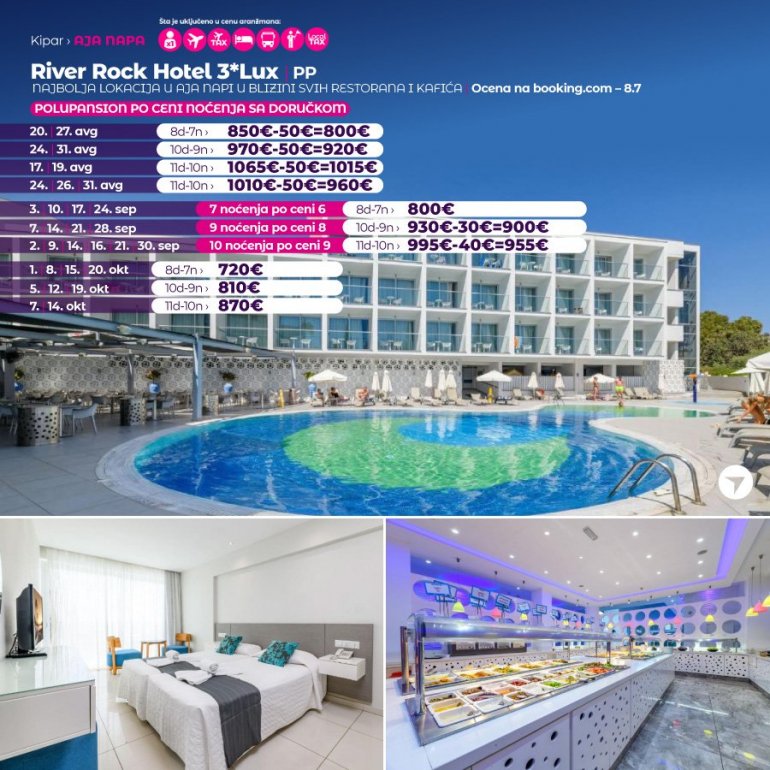 Hote River Roc nalazi se u mestu Aja Napa i poseduje otvoreni bazen i terasu za sunčanje. Na raspolaganju je dečije igralište, a besplatan bežični internet je dostupan u celom objektu. Sve sobe nude balkon sa pogledom na grad. Pored toga sadrže flat-screen TV i klima-uređaj. Gostima je na raspolaganju sopstveno kupatilo sa tušem i fenom za kosu. Dodatne pogodnosti uključuju sef, frižider i posteljinu. Ponuda hotela River Rock uključuje recepciju koja radi non-stop, vrt i bar.