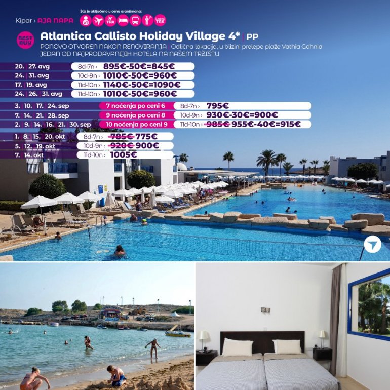 Callisto je kompleks osmišljen kao kopija tradicionalnog mediteranskog sela sa belim dvospratnim vilama plavih šalona, prozora i vrata. Vile su okružene egzotičnim drvećem i cvećem, povezane uzanim stazama sa centralnim delom hotela, u kome se nalazi restoran, recepcija, bezeni i prolaz do prelepe peščane plaže. Idealan izbor za porodice sa decom i sve ostale koji uživaju u raskošnoj prirodi, a na nekoliko minuta hoda od glavne ulice poznatog letovališta Aja Napa. Centar grada udaljen je 1,5km. Besplatan ulaz u akva park nedaleko od hotela!