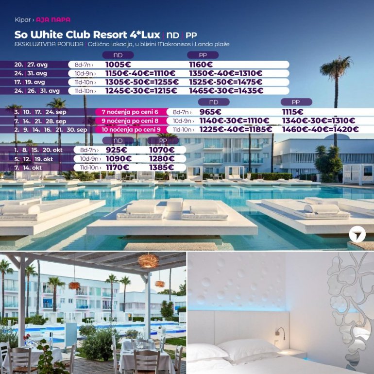 Objekat So White Club Resort nalazi se na predivnoj Zlatnoj plaži u letovalištu Aja Napa. U ponudi su bazen u stilu lagune sa plutajućim ležaljkama i nagrađivani restoran. Ovaj butik hotel u Aja Napi je dizajnirao jedan od najboljih 50 dizajnera na svetu. Pored zadivljujućih tropskih vrtova nalazi se potpuno beo bazen, koji može menjati boje, sa jedinstvenim efektom neba u pozadini. Na plaži su dostupni sportovi na vodi, gnjuranje i ronjenje. Kosmopolitski centar noćnog života Aja Nape nalazi se na samo 3,5 km od hotela i do njega se lako i brzo stiže autobusom i taksijem.