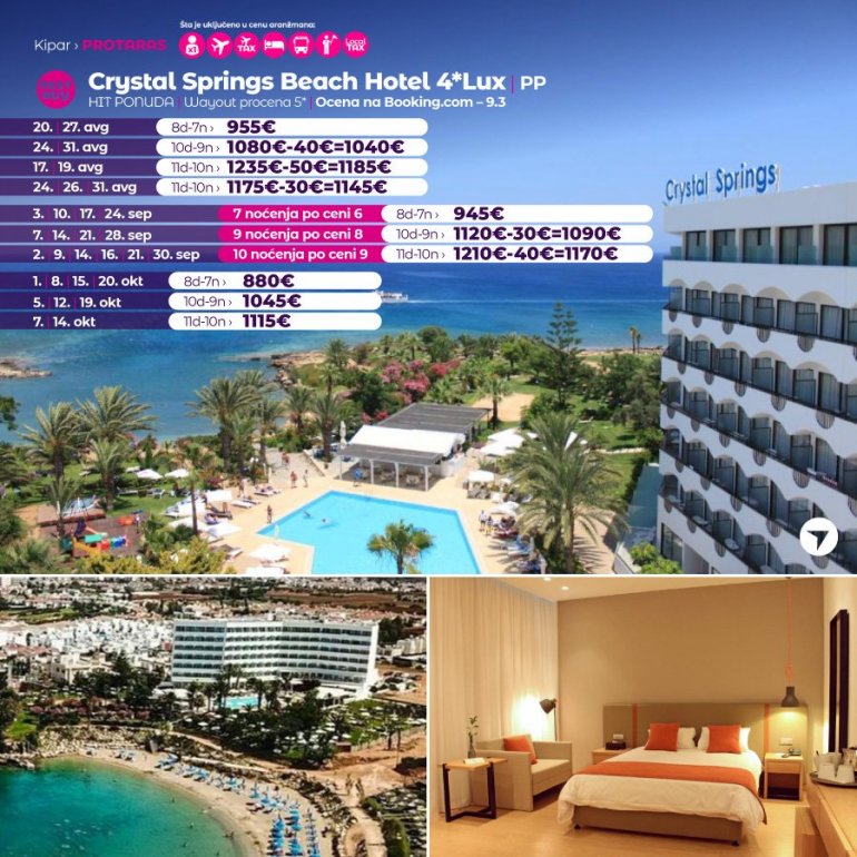 Hotel se nalazi u blizini živopisne ribarske luke, na 5 km od Protarasa. Gostima su u okviru hotela na raspolaganju otvoreni bazen, zaseban dečiji bazen i sobe sa nameštenim balkonom i pogledom na Sredozemno more. Sve sobe hotela Crystal Springs Beach su klimatizovane i svetle. Ponuda restorana Salamina obuhvata tematske večeri, internacionalne specijalitete, regionalnu hranu i poseban dečiji meni.