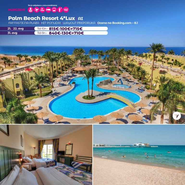Palm Beach Resort hotel sa 4 zvezdice nalazi se u Hurgadi i nudi sobe sa balkonom uz živopisan pogled na Crveno more. Poseduje 2 bazena, privatnu plažu i ronilački klub. Klimatizovane sobe hotela Palm Beach Resort imaju raznobojan enterijer sa drvenim nameštajem. Sve sobe uključuju satelitsku televiziju, mini-bar i sopstveno kupatilo. Hotelski restoran sa uslugom na bazi švedskog stola nudi lokalna jela kao i internacionalnu kuhinju. Bar nudi osvežavajuća pića i lagane obroke.