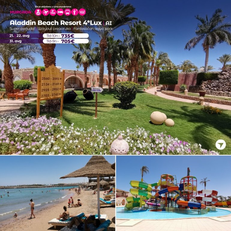 Aladin Beach Resort je hotel sa 4*, koji se nalazi u južnom delu Hurgade, Safagi na peščanoj plaži. Od aerodroma je udaljen 7 kilometara. Hotel raspolaže sa 390 soba i sve sobe imaju klimu, TV, telefon, frižider, rum servis, krevetac je moguće obezbediti na zahtev, kao i sef koji se dodatno plaća. Gostima hotela su na raspolaganju bazen, glavni restoran, italijanski restoran pored bazena, gril bar pored plaže, klub za decu, diskoteka, 2 bara, tenis teren, skvoš teren, centar za ronjenje, akva centar i centar za windsurfing, internet kafe, šatl bas, mini golf, kriket, sauna i sobe za masažu.