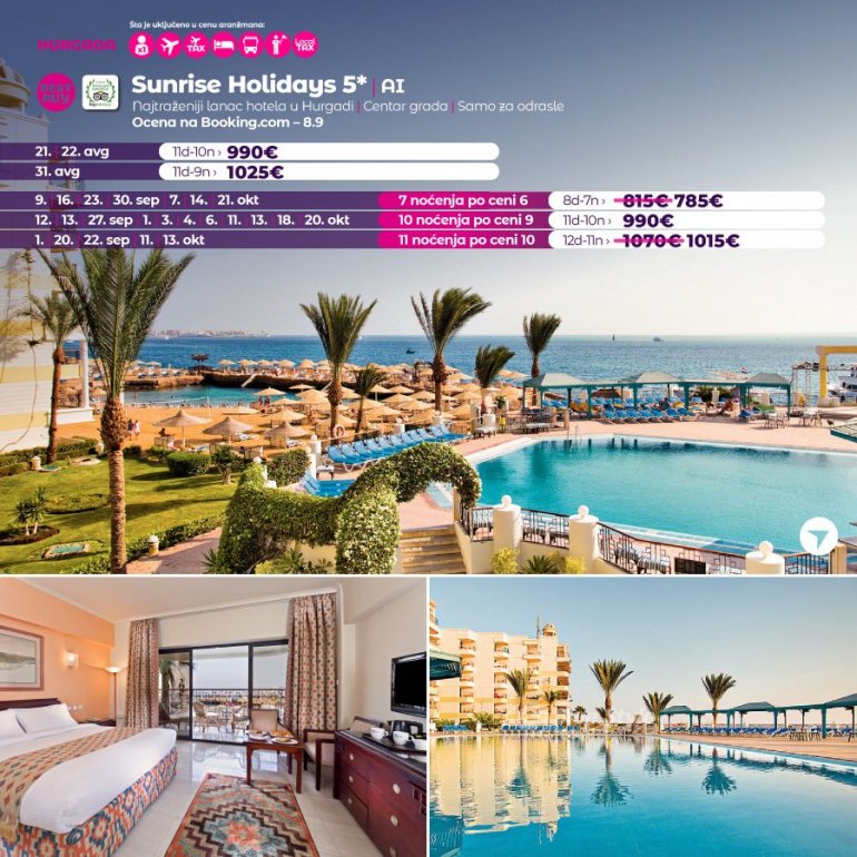 Vreme je idealno da posetite Hurgadu, a kao turoperator br. 1 po broju putnika iz regiona poslednjih 10 godina, za svoje putnike smo na osnovu dugogodišnjeg iskustva izdvojili iz ponude BEST BUY hotele koji imaju najbolji odnos cene i kvalitet.
